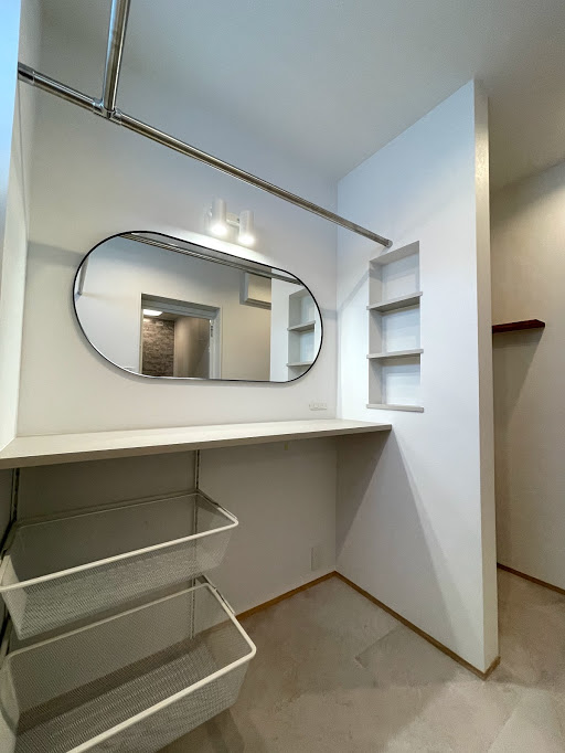 鏡やバスケットはIKEA製。シンプルでカッコかわいいです!